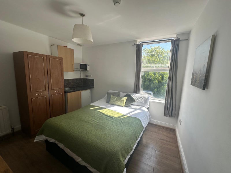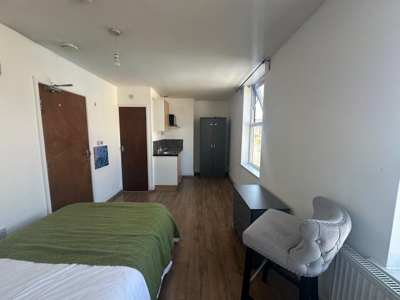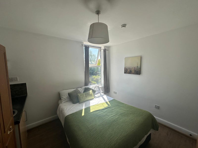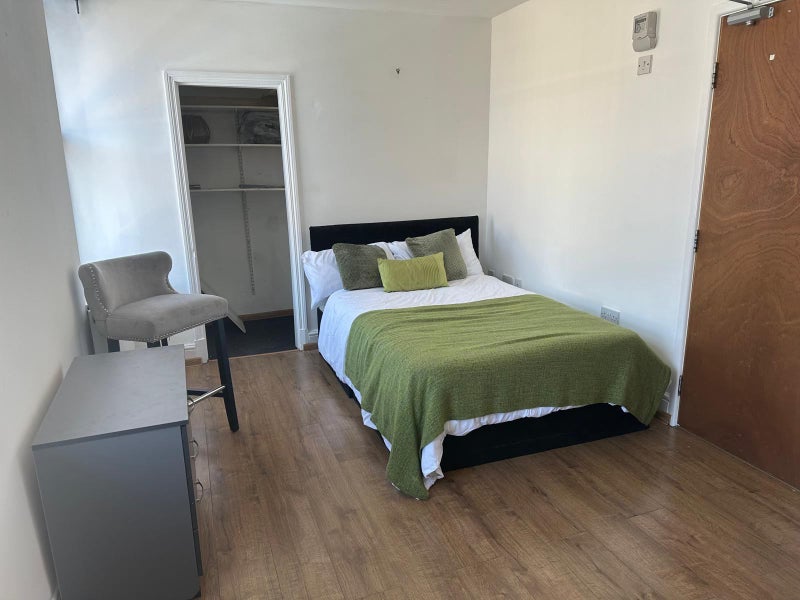 Room 6 is kitted out with a double bed, wardrobe, drawers, bedside table, Stool and food prep/desk area with under counter fridge, sink and dry food storage cupboard. This room benefits from private ensuite