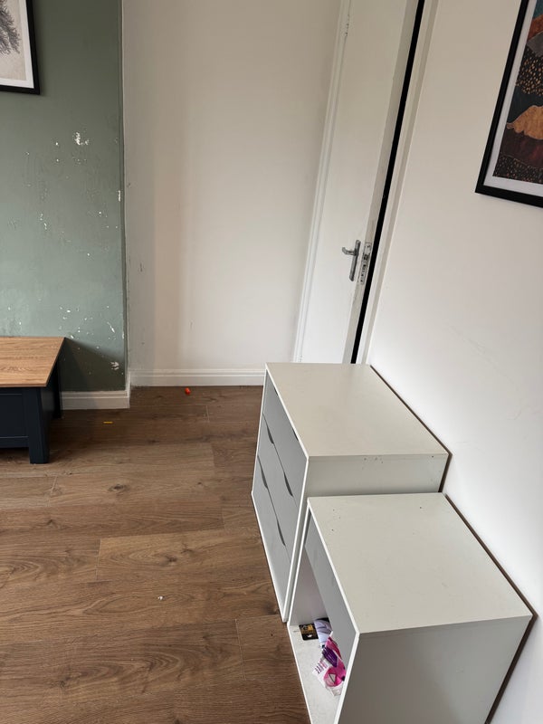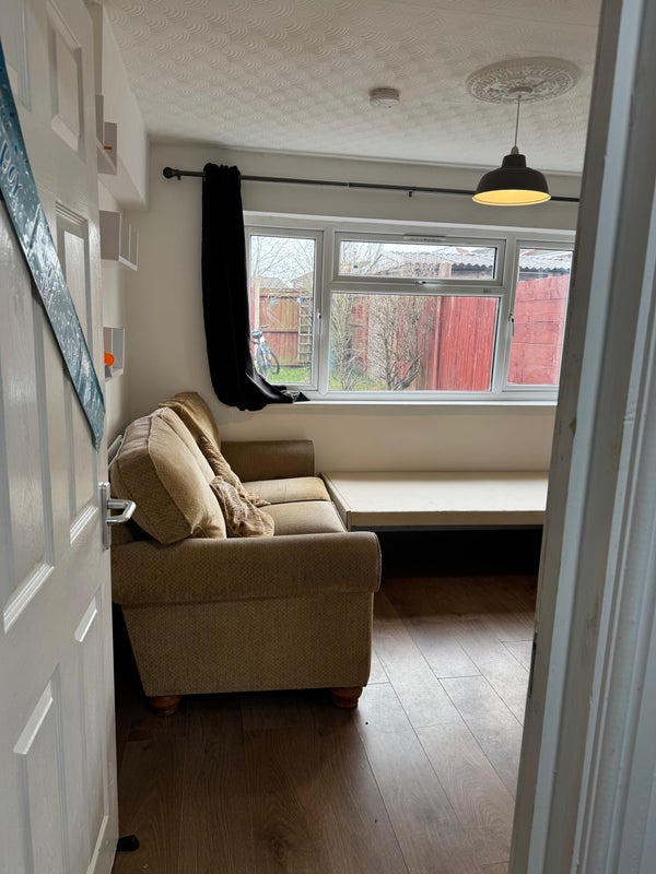 Single bed, one cupboard, two drawers or side tables. If you want to keep the sofa it can be done but you have to let me know in time or else it will be removed.