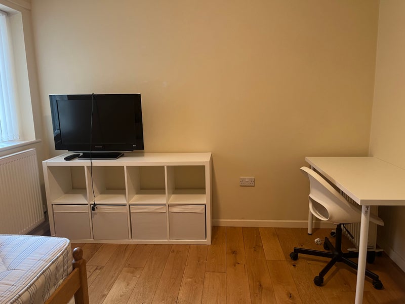 There are two bedrooms, two bathrooms, and a large open-plan kitchen and living area. You’ll have the main bathroom to yourself (with a bath/shower) as I use the en-suite. The room comes with a single bed, desk, chair, storage, and a TV. You’ll also have your own closet just beside the room with clothing rails. I’m happy to add extra storage if needed.