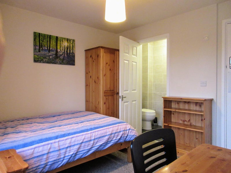 Room 4, available at £620 pcm, is a double room located upstairs and with its own ensuite shower room. It is furnished with a 4ft double bed with good-quality mattress, wardrobe with large drawer at the base, bedside table with drawers, dressing table / desk, chair and bookshelves, plus CAT5 socket and TV aerial point.