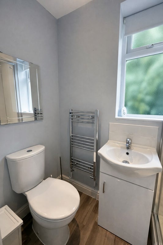 Refurbished bathroom with shower, toilet and wash basin with a cupboard for storing your toiletries.