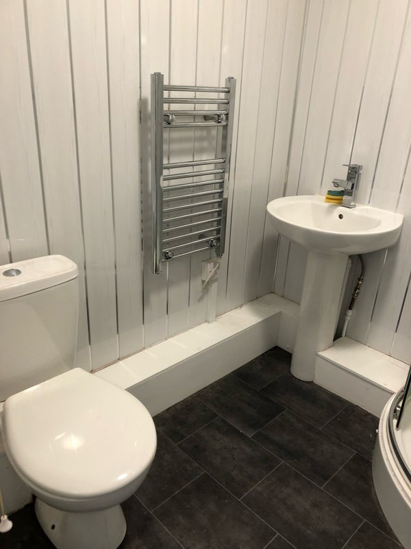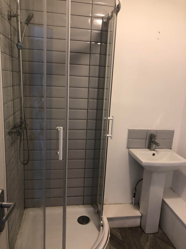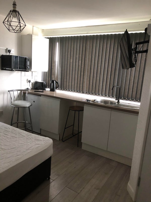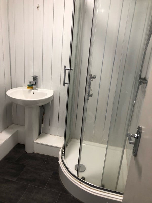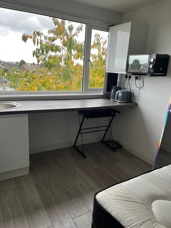 Block of flats located in pleasant grounds with grassed areas. Close to local shops and close to supermarket. Located on a main bus route and close to train station and tram. There is a large car park with cctv. The room has a kitchenette with microwave and fridge. There is a large shared kitchen with oven and hob and washer and dryer.