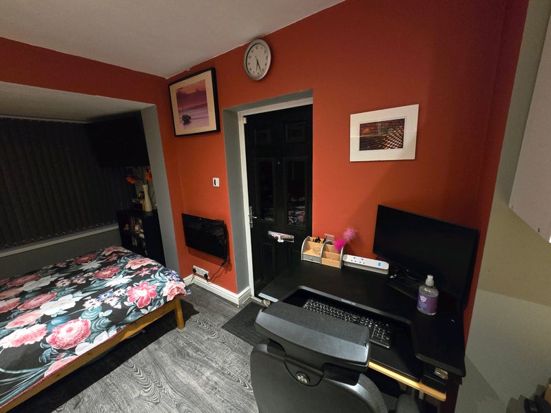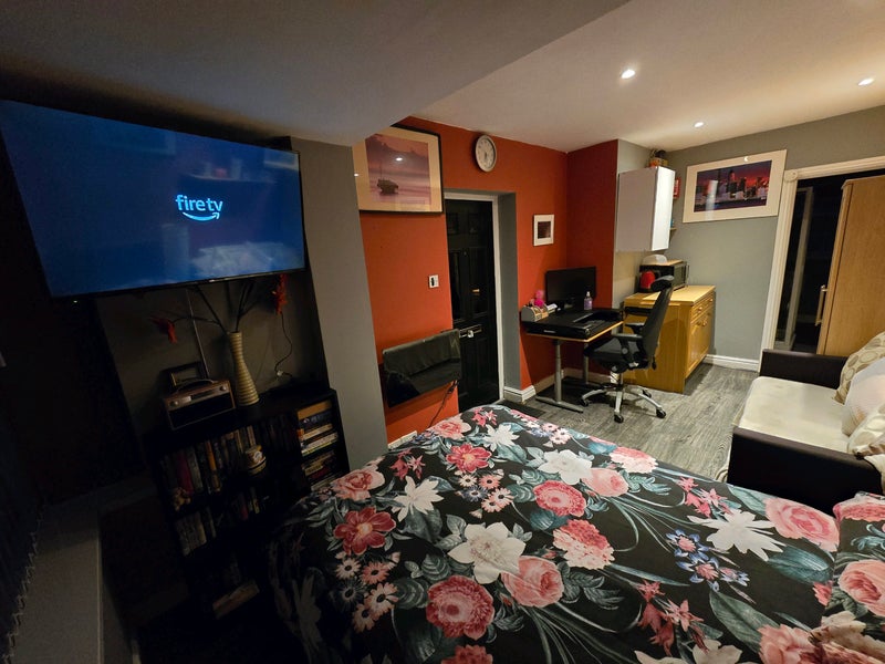 Comfort & Storage: Fully furnished with a wardrobe, Dedicated Desk/Workspace, office chair, Comfortable Double Bed, Large Wall-Mounted Smart TV, small coffee table, and Sofa/Seating Area.