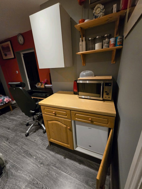 Kitchenette: Your dedicated area features a toaster, microwave, and fridge for easy meal prep.
