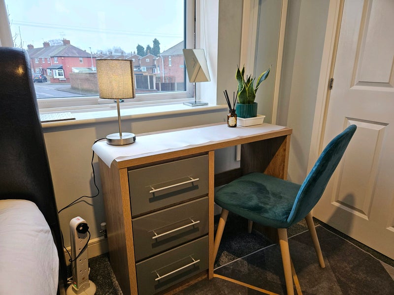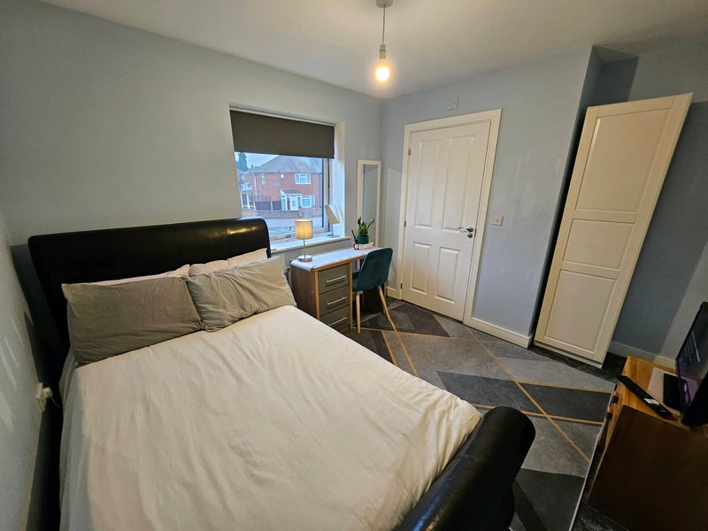 A cosy, fully furnished room with double bed, built in wardrobes, bedside table, desk & chair, plus a private ensuite shower room 🌼