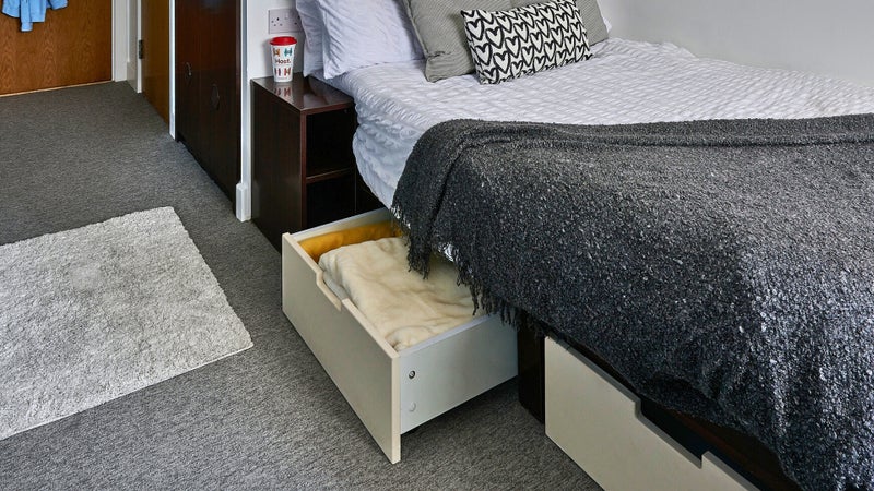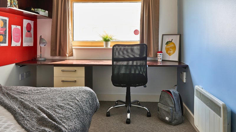 Fully furnished en-suite bedroom from 7m². Room features 3/4 double bed with underbed storage, bedside table, wardrobe, private en-suite bathroom, large desk and chair. Free wi-fi and contents insurance. All bills included in rent.