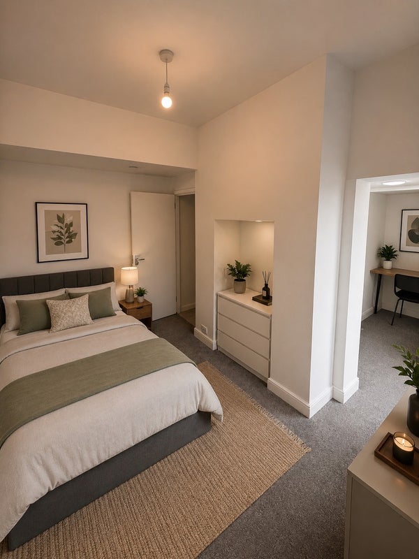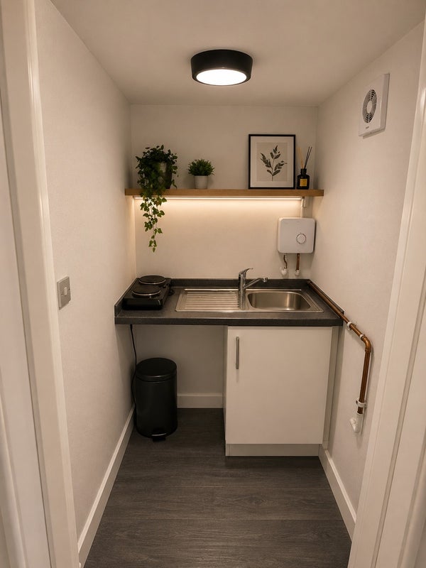 The studio features a bright bedroom/living area with neutral décor, creating a clean and relaxing environment. There is a private shower room and a separate kitchenette equipped with essential appliances, providing everything needed for day-to-day living.