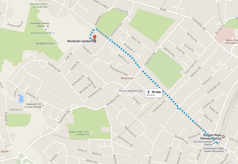 16 min walk to Bognor train station (0.8 mile), 4 min by car or 5 min by bus or bike.