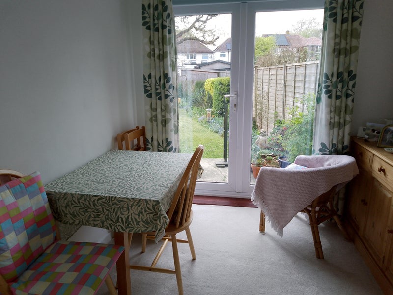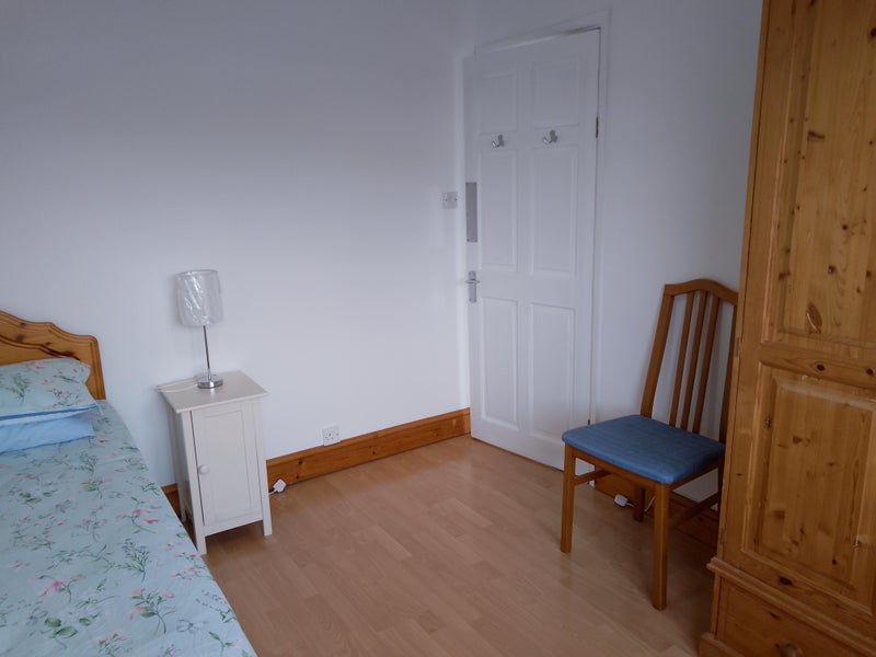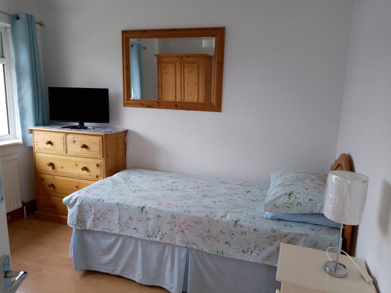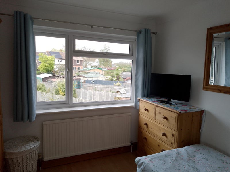 My house is in a quiet location with a pretty garden that you are welcome to sit in. Your room has a single bed, double wardrobe, chest of drawers, bedside cabinet and a chair. A desk and small bookcase are available if you need them. I am out and about a lot during the day so I'm glad of some peace and quiet in the evenings, although it's nice to catch up with my lodger at some time, usually in the evening. I have found with previous lodgers that we work well around each other regarding use of bathroom and kitchen. There is roadside parking. Town is 15 minutes walk, although there is a Co-op 5 minutes away. The station is 20 minutes walk. I'm looking for someone who is friendly and cheerful, considerate, (no loud music, and no musicians please), and tidy, leaving the bathroom and kitchen as they find it.