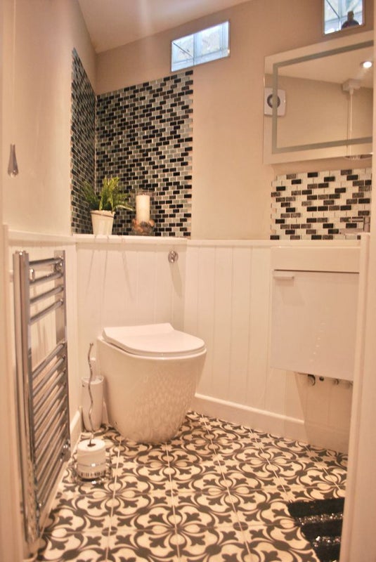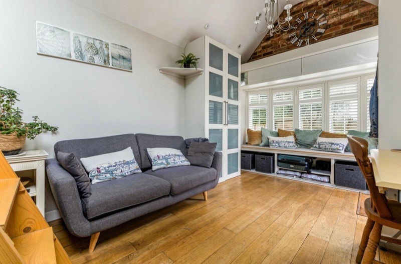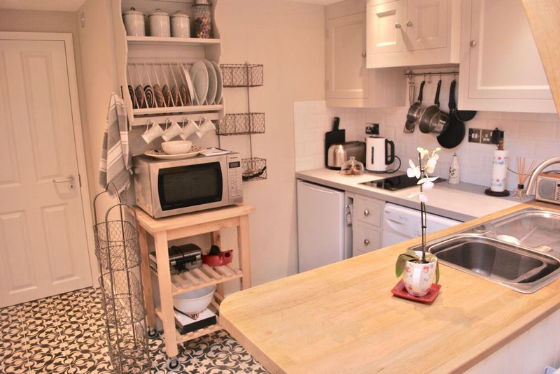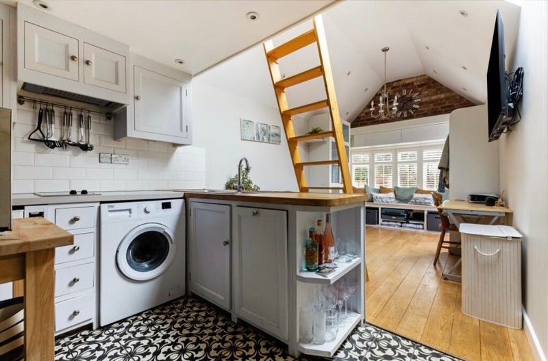 Modern detached studio apartment with a mezzanine floor with a sunken double bed (the mezzanine floor also has USB, plug sockets and lights).