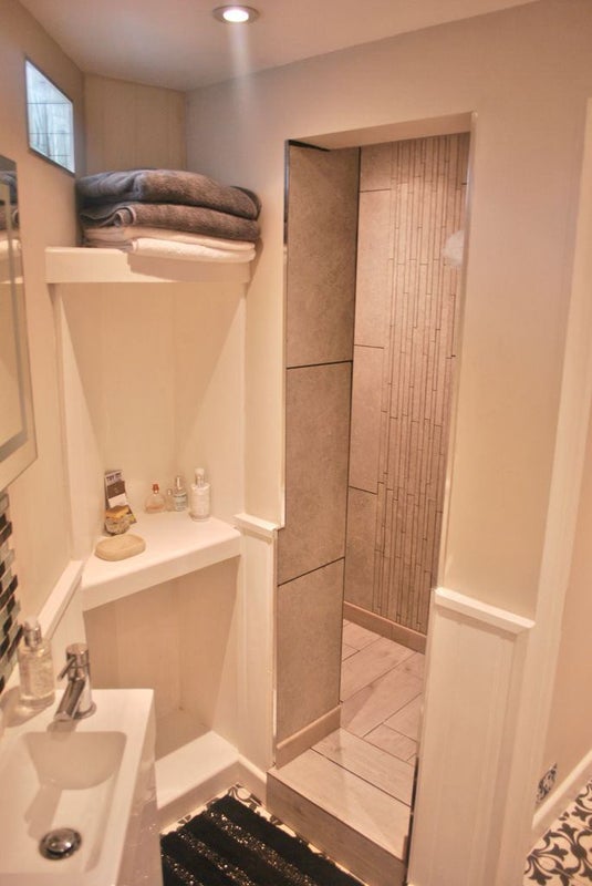 On the main floor there’s a large wall mounted TV, sofa & desk. The kitchen area has a microwave, washing machine, oven and fridge. All kitchen utensils/crockery/cutlery are included.