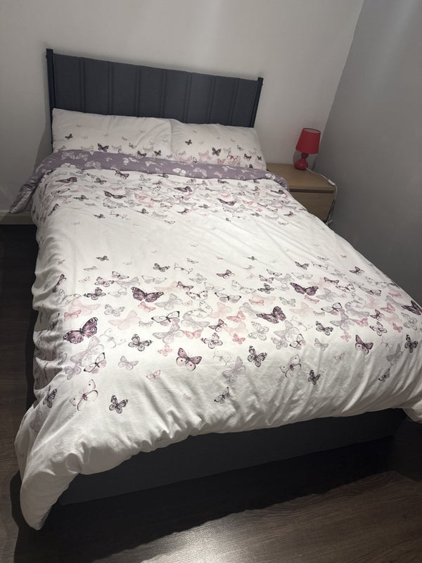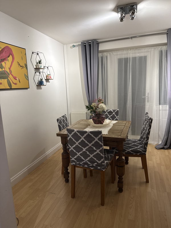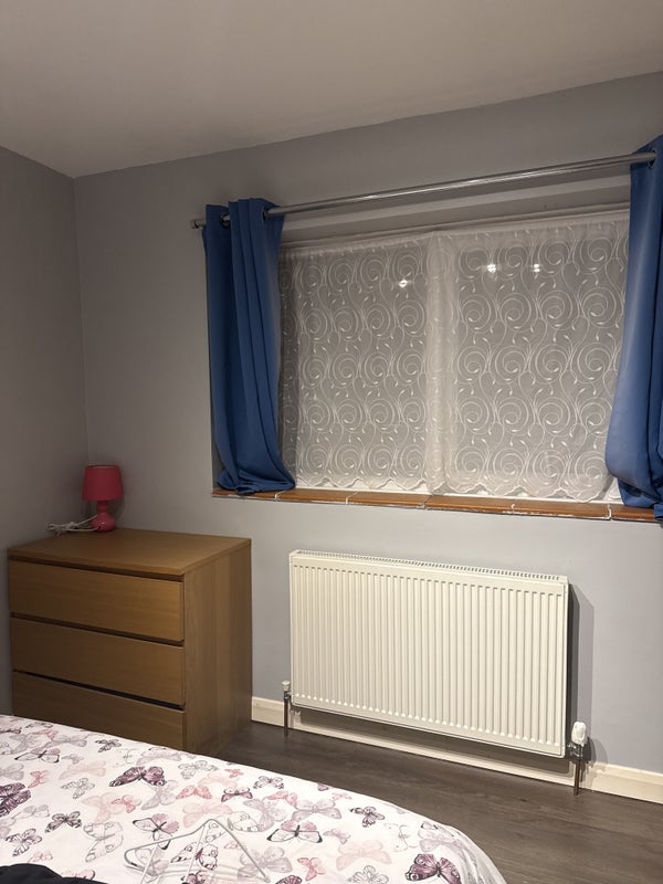 Double toon for rent in a three bedroom house. The house has a living room and dining area, a big garden and a garage.