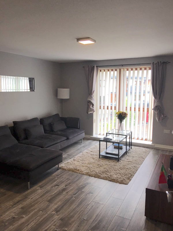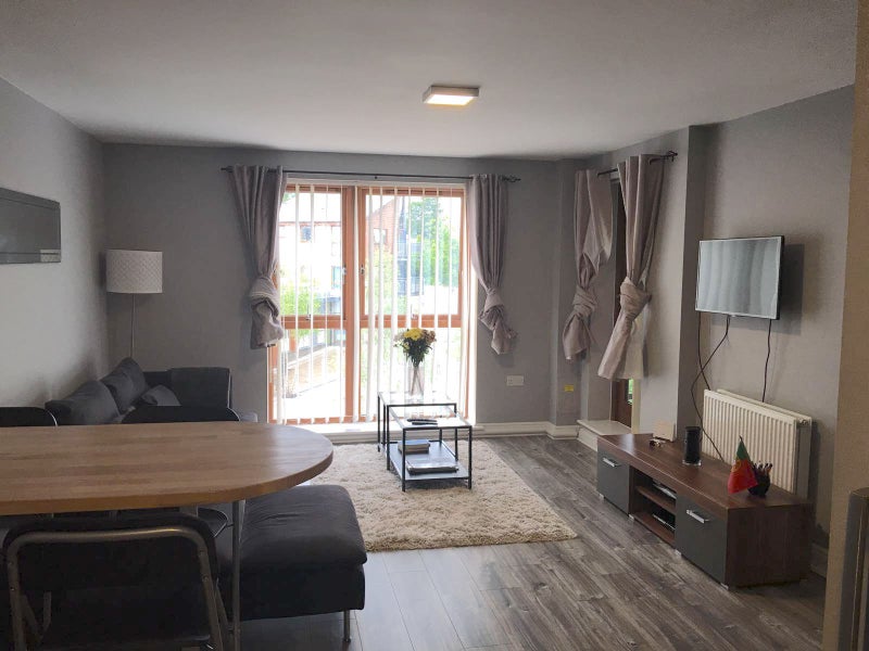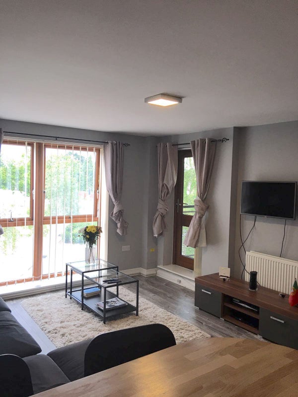 The apartment has laminate flooring and is fully furnished. Blackout curtains in all rooms. Cooking equipment supplied (plates, bowls, cutlery, pots, pans, glasses, mugs, etc). Appliances supplied (washing machine/dryer, toaster, kettle, microwave). Fast broadband provided.