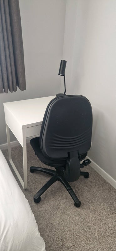 A large, bright double room. There is a generously sized airing cupboard for your own personal use heated by it’s own internal radiator so no damp towels, trips to the laundrette to dry washing, or drying clothes strung around the room. The corner of the room is set up as a work/laptop area including a desk with draw,, lamp and comfortable adjustable office-style chair (the upgraded chair shown in close up has now replaced the chair shown in other pictures). There is also an armchair for relaxing with free-standing lamp. The room has abundant storage – a large wardrobe, chest of drawers, and lots more easily accessible space under the double ottoman bed. Before you move in, a key lock will have been fitted on the bedroom door in addition to the internal sliding lock already in place. There is a choice of two wall-mounted full length mirrors. There are blinds for adjusting light levels in the room. The designer has aimed for a colour scheme that is easy on the eye.