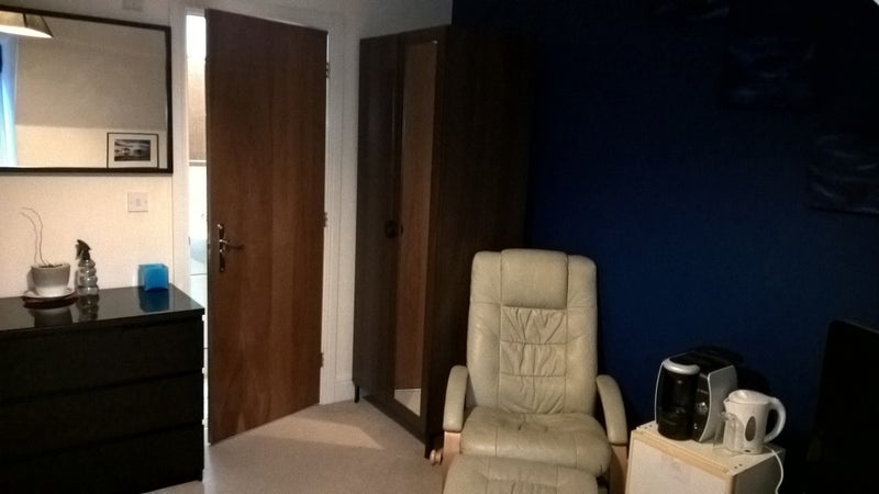 Located on the top level with excellent privacy, the bedroom has coffee making machine, laptop stand, full Sky+ package including movies and all Sky sports channels, flat panel TV, unlimited Gigabit fibre broadband, etc. Short or longer-term lease by arrangement, minimum three months. Access to garden, house areas and all household equipment.