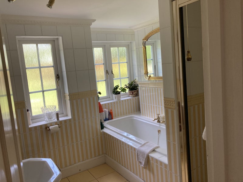 Light and spacious triple aspect room in country house; with double bed. Large family bathroom Ethernet and broadband connections. Shared use of kitchen/dining room, laundry and large garden.