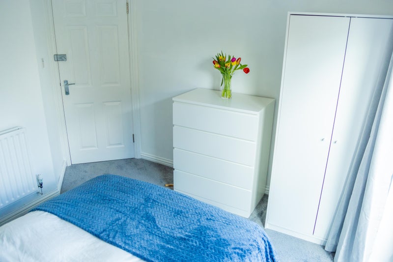 Double room with private shower room (along corridor) available now in modern townhouse in central position close to Three Bridges and Crawley train stations.