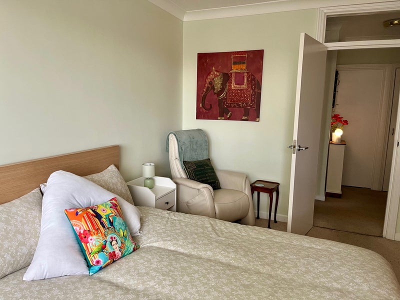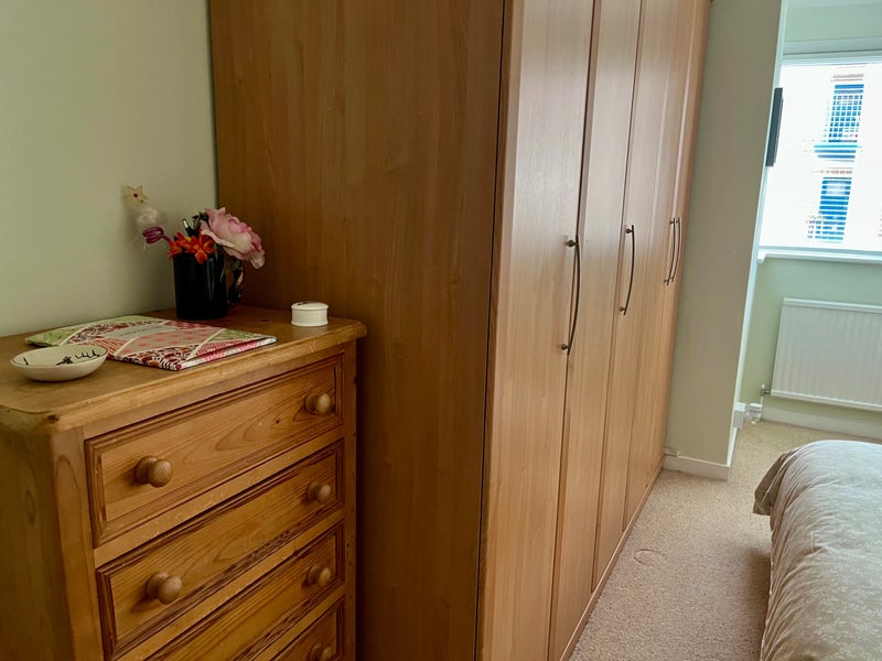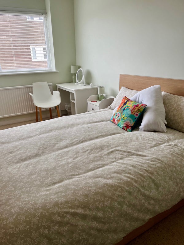 Large double bedroom recently decorated in a second floor flat with a lift. Furnished with a king size bed with drawers under, bedside cabinet and two built in double wardrobes with plenty of storage. Reclining chair, desk & chair with a mirror for use as a dressing table and chest of drawers. Two bedside cabinets.