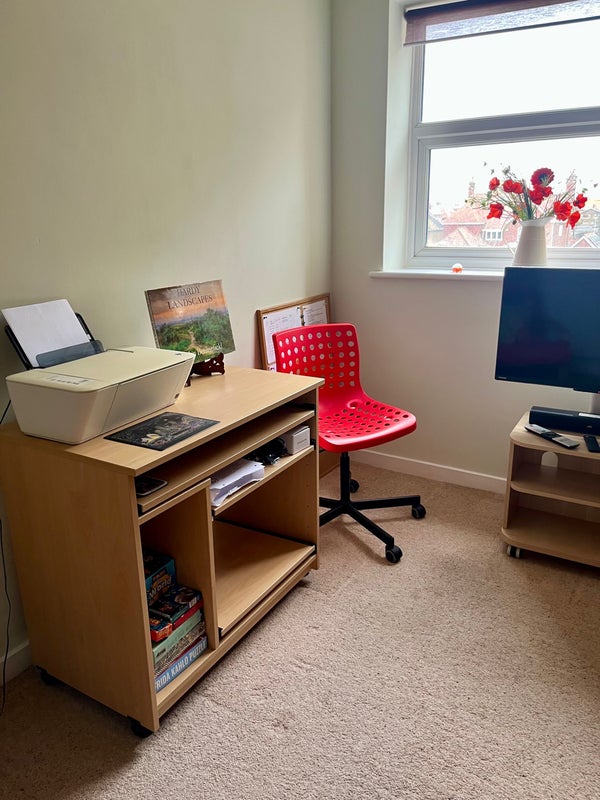 Recently decorated separate adjacent small sitting room with a chair, desk and a smart tv with freely. This is for the house guest’s sole use in the evenings but the live in owner will need access to her books and the printer during the day.