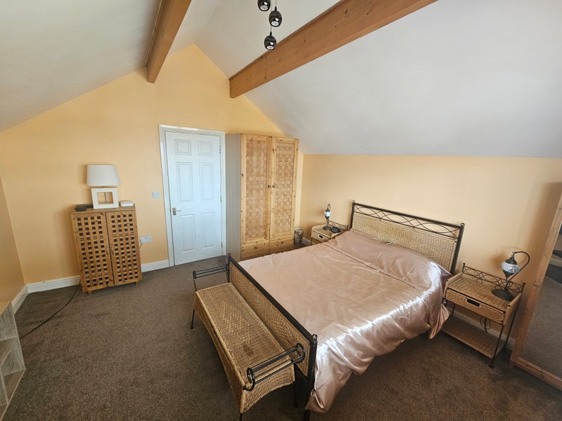 Room contains 1 double bed, double wardrobe, 2 side tables, a TV cabinet/stand, drinks fridge, handy shelving, cupboard and a bench which can be removed if necessary. There is still lots of room for desk and/or other furniture.