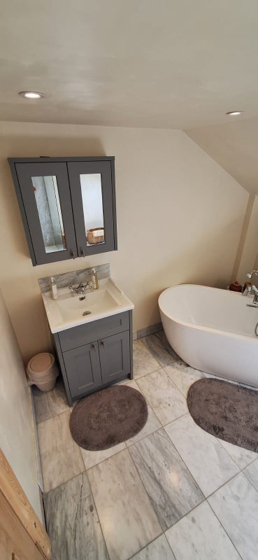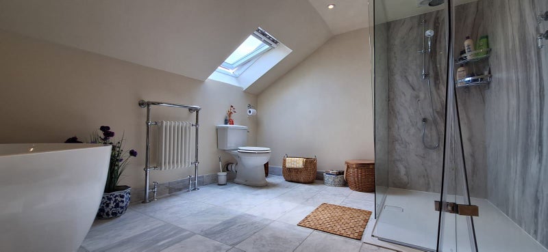 * Classy top room conversion en suite, heated marble flooring in spacious bathroom.