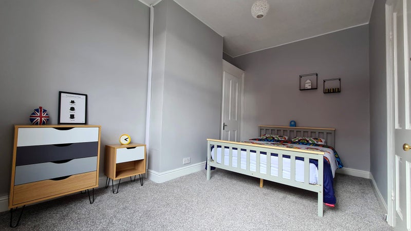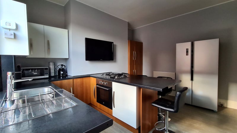 The room has set of furniture, double bed with comfy mattress, chest of drawers, wardrobe and share access to a bathroom with bath/shower as well as a lovely decorated lounge and spacious kitchen which is fully furnished with oven and five burner gas hob, a big american stile fridge-freezer, washing machine, microwave, kettle, plenty of cupboard space, dining island and chairs.