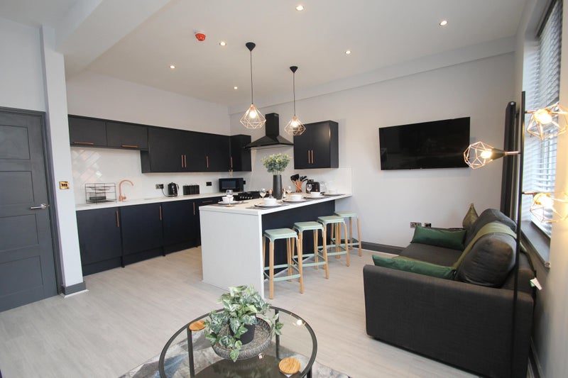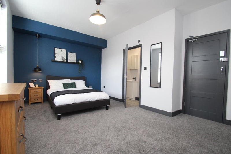 Each room is fitted with a key-less digital lock for easy access, comes fully furnished with oak wardrobe, chest of draws and bedside table, has a double bed and is finished with dark blue feature wall, USB bedside socket and designer bedside down light.