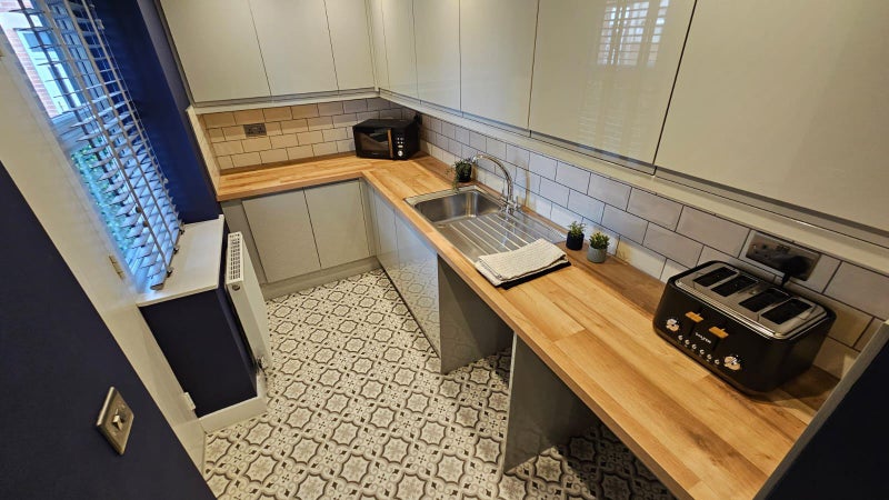 Located on the ground floor, the spacious communal kitchen is both stylish and practical. Patterned tile flooring and vibrant purple walls set a lively tone, complemented by sleek gloss light grey cabinets and warm wood counter-tops. Two stainless steel sinks, a tall fridge/freezer, integrated hob and oven, microwave, toaster, and bar stools make this kitchen ideal for shared living. A wall-mounted TV adds a social touch.