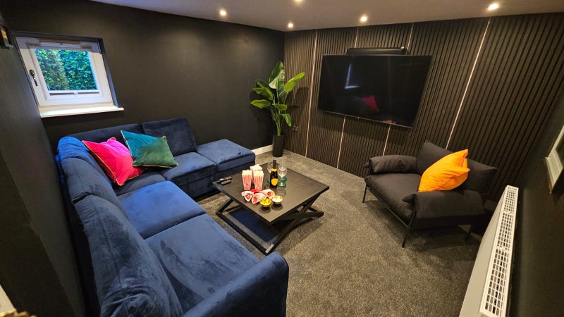 Tucked away in the basement is a cosy communal cinema room! Complete with comfortable seating, a coffee table, plush grey carpet, and bold purple walls, this space centres around a large wall-mounted TV, offering the ultimate spot for film nights or weekend binge-watching.