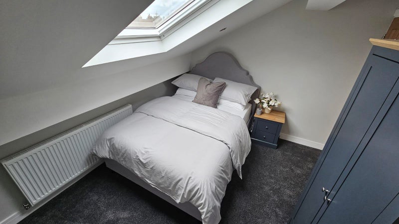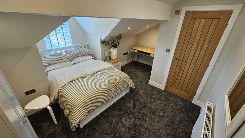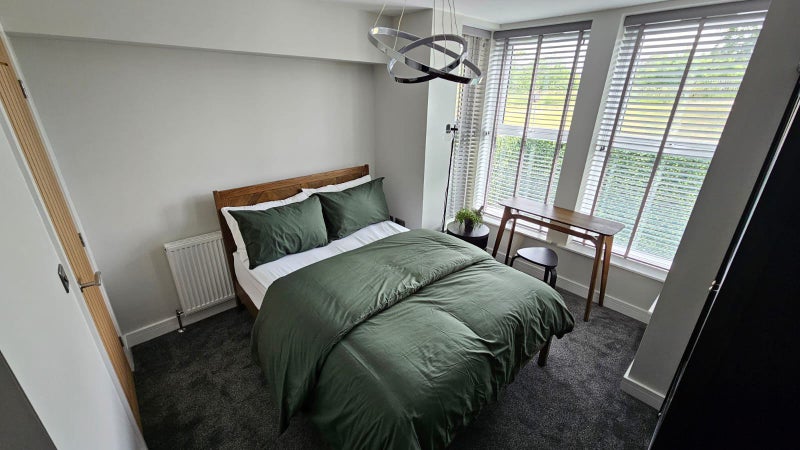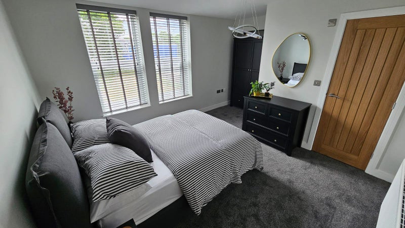 These bright and comfortable double bedrooms feature soft grey carpet and clean white walls for a fresh, modern finish. A double bed is paired with modern furniture including a bedside table, wardrobe, and chest of drawers. Large windows allow natural light, and décor adds character such as lamps, mirrors and vases. All bedding and towels included!
