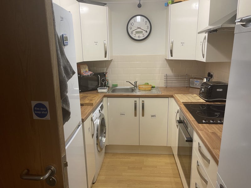 Our kitchen is shared between four other rooms. We keep it neat and tidy at all times. For example, dishes are never left out overnight, and we clean up immediately after cooking.