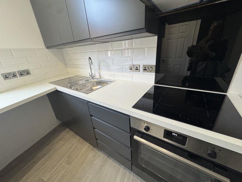 •Modern brand-new fitted kitchen featuring an electric hob, oven and extractor chimney.