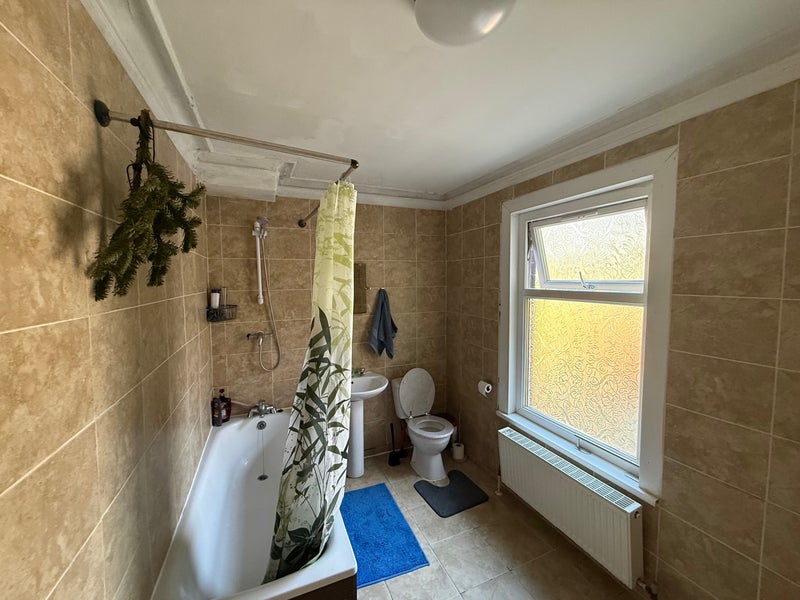 • Bathroom is fully tiled, with matching floor and wall tiles, a bath, shower, and is very large