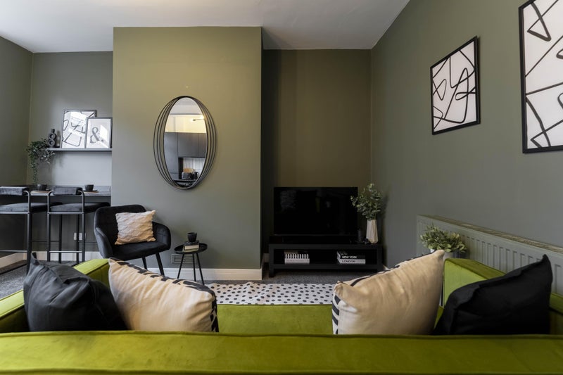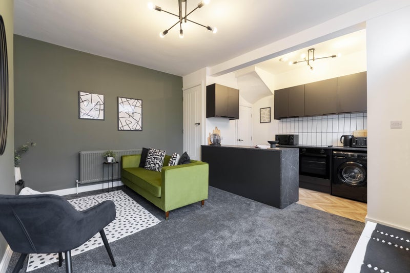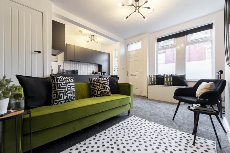 - open plan kitchen & living room with velvet seating, breakfast bar & fully fitted kitchen