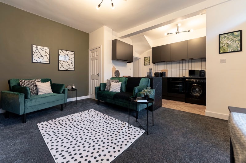 - open plan kitchen & living room with velvet seating, breakfast bar & fully fitted kitchen