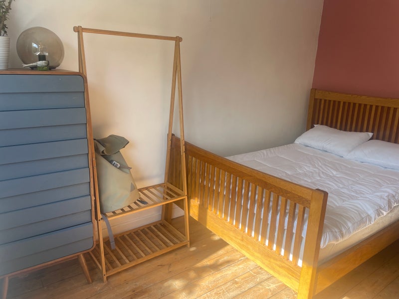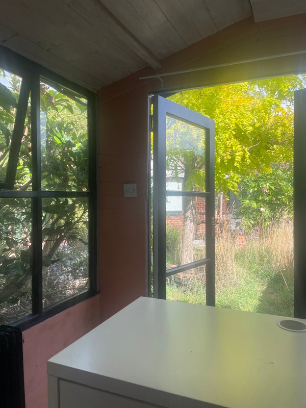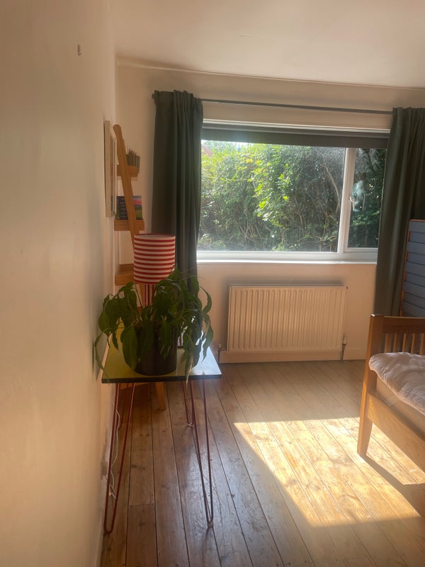 The room has a double bed / rail / drawers and we can move things/ add new things. It overlooks a private garden with small outdoor summerhouse , which can be used to work from with a desk in it.