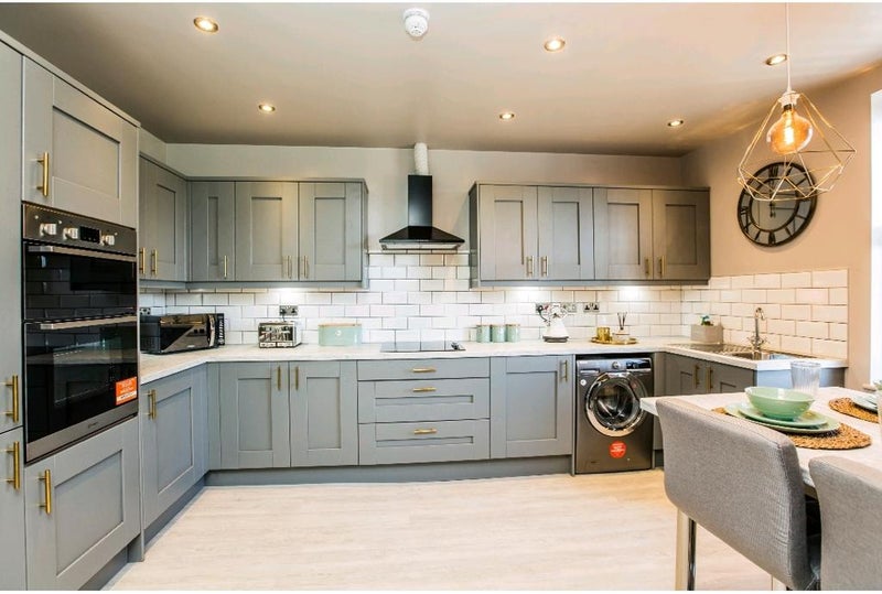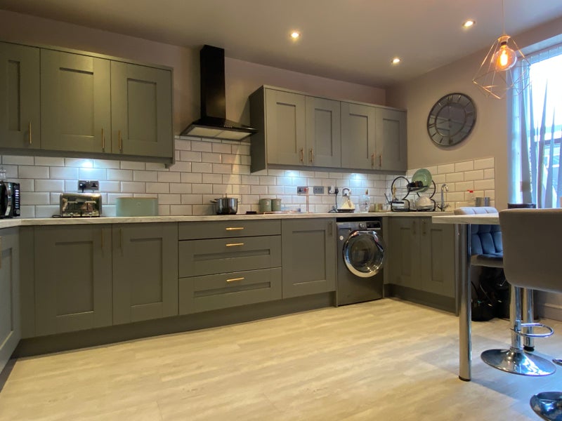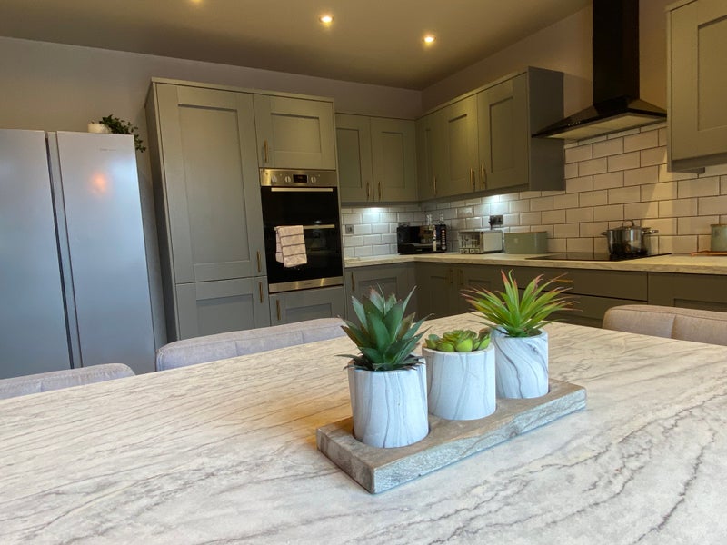 The shared kitchen has a large range of painted wood base and wall units giving good storage for sharers. There is a large American style fridge-freezer, stainless steel electric double oven, ceramic hob with extractor above, stainless steel sink with mono tap and a washing machine. Many small appliances are provided as well as a supply of table ware, crockery and cutlery. There is a breakfast bar with stools and a large screen TV.