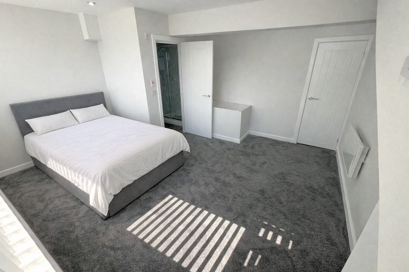 A generously sized double bedroom featuring plush new carpeting and neutral décor — a peaceful, comfortable space ideal for relaxation.
