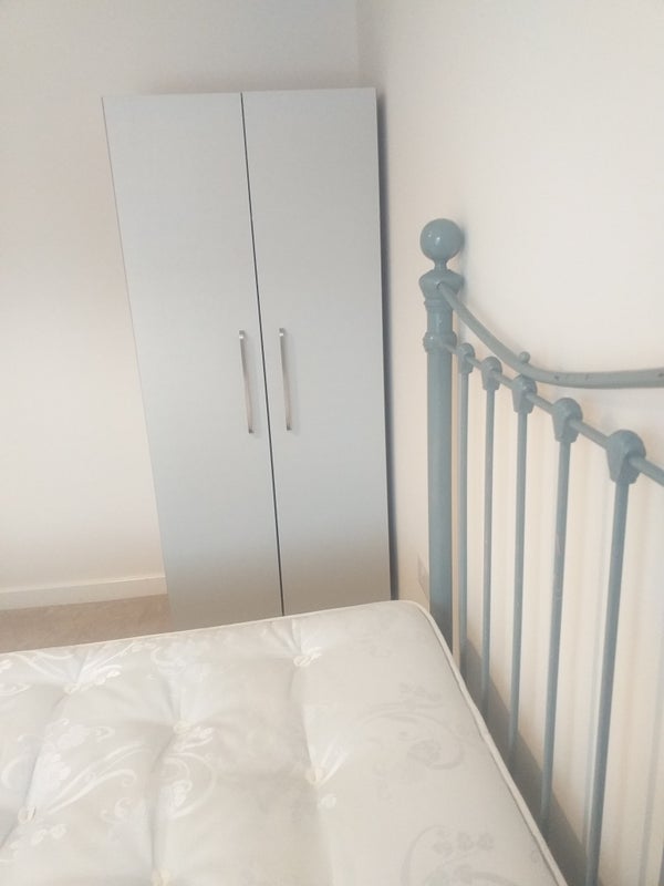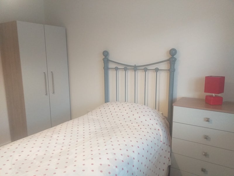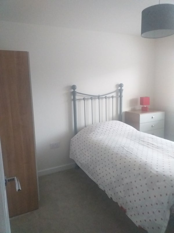 There is a single bed with new high quality mattress, wardrobe, drawers. The window has a blind and there is a new carpet, lamp, TV with Freeview box.