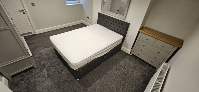 🛏️BEDROOM - Room 1. Beautiful Double bedroom with modern furniture, double bed, wardrobe, chest of draws and side table with lovely grey carpet.