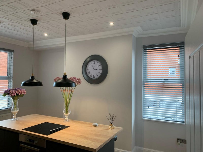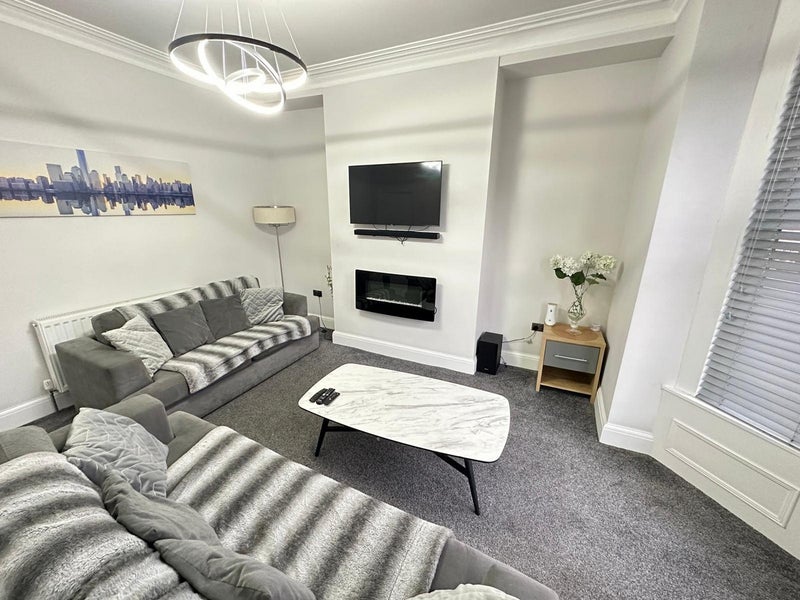 🛋️LIVING ROOM: Entering from the front door, the large living room is decorated neutrally with cream walls, wooden floors and bright white woodwork. Fitted with an electric fireplace, TV and lamp and sofas.