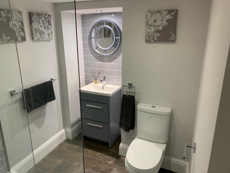 🛁BATHROOM: Modern Ensuite Bathroom with a walk-in shower, storage sink and toilet with modern grey tiles.