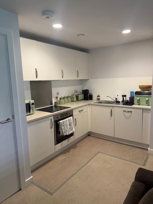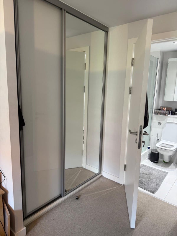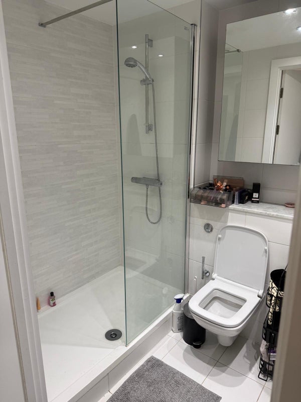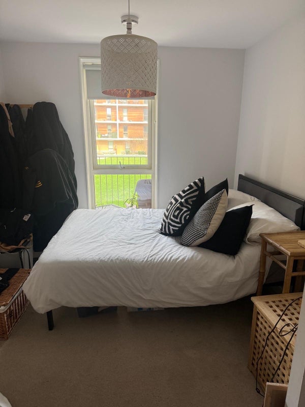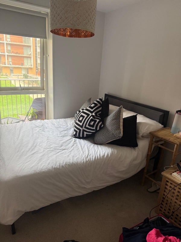 Double en-suite room, shared living room and kitchen area, balcony. Free gym in complex, cinema room can be booked free of charge, parking available on site (extra fee). Living with a single professional female.