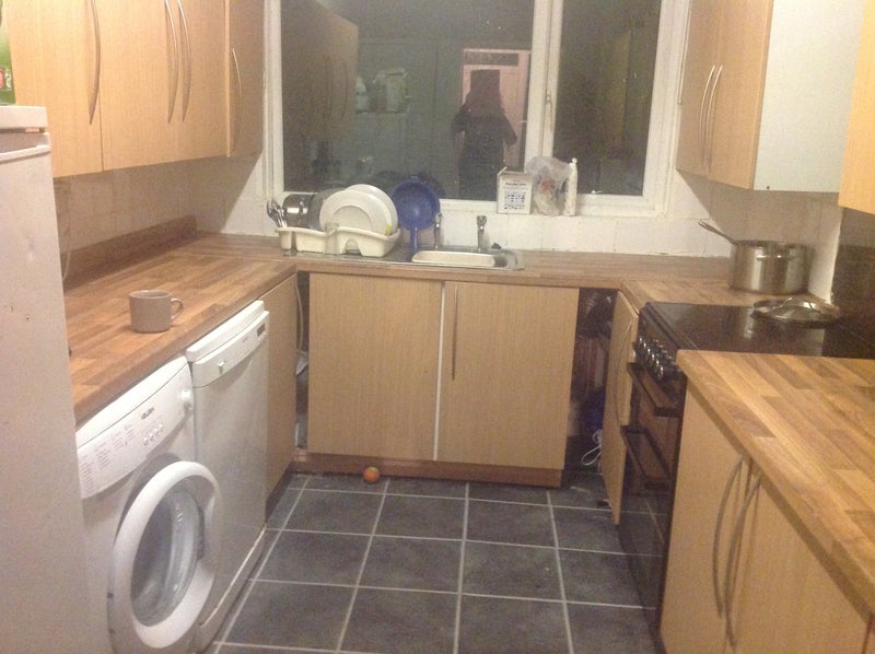 A shared kitchen with cooker, microwave, toaster, washing machine and dishwasher