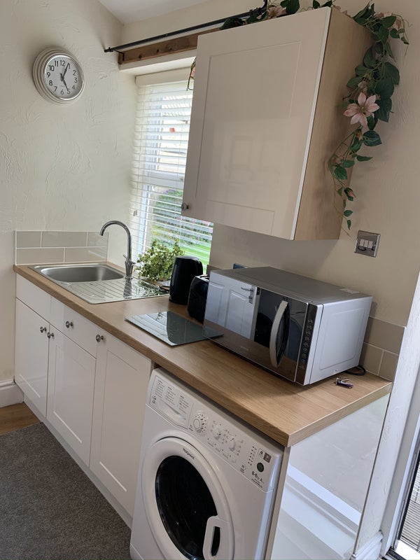 Fitted kitchen with fridge freezer, electric hob, washer/dryer, microwave, utensils etc.