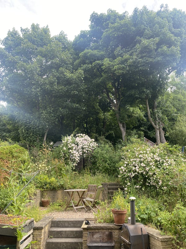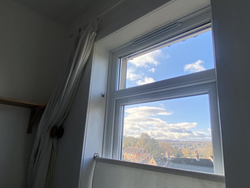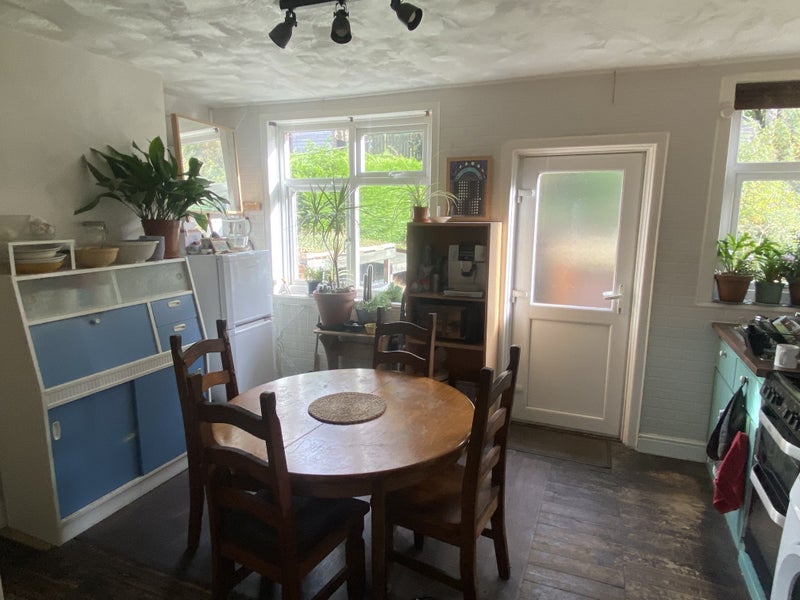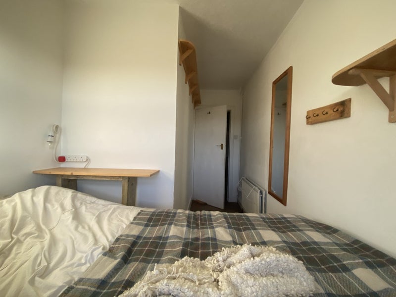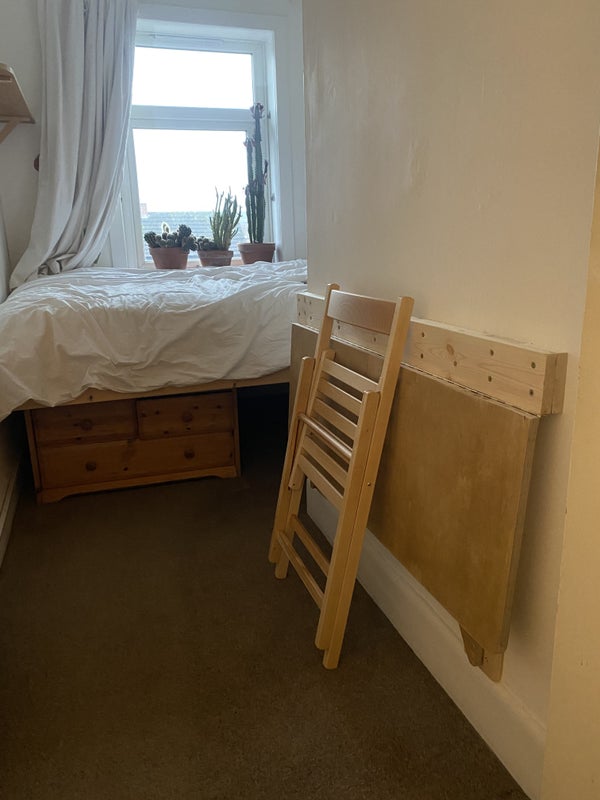 Box room with double bed, storage space, outside the room wardrobe, view, shared lounge, dining kitchen, houseplants, garden, flowers and neighbourhood cat.