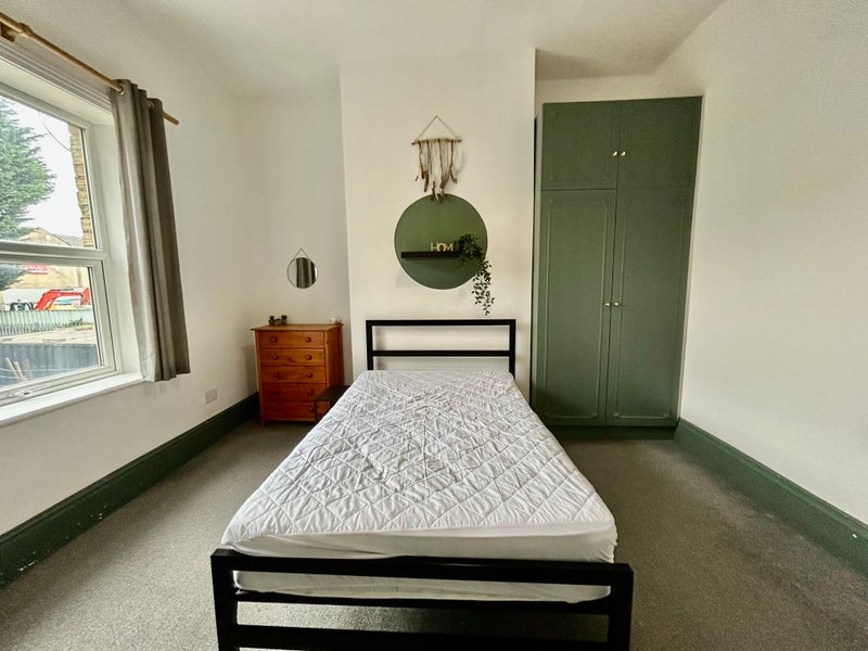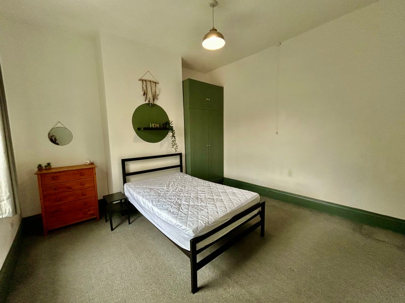 A spacious and modern double bedroom located on the first floor within this smartly presented and refurbished house. The room features a double bed with mattress, bedside table, built in wardrobe and chest of drawers.