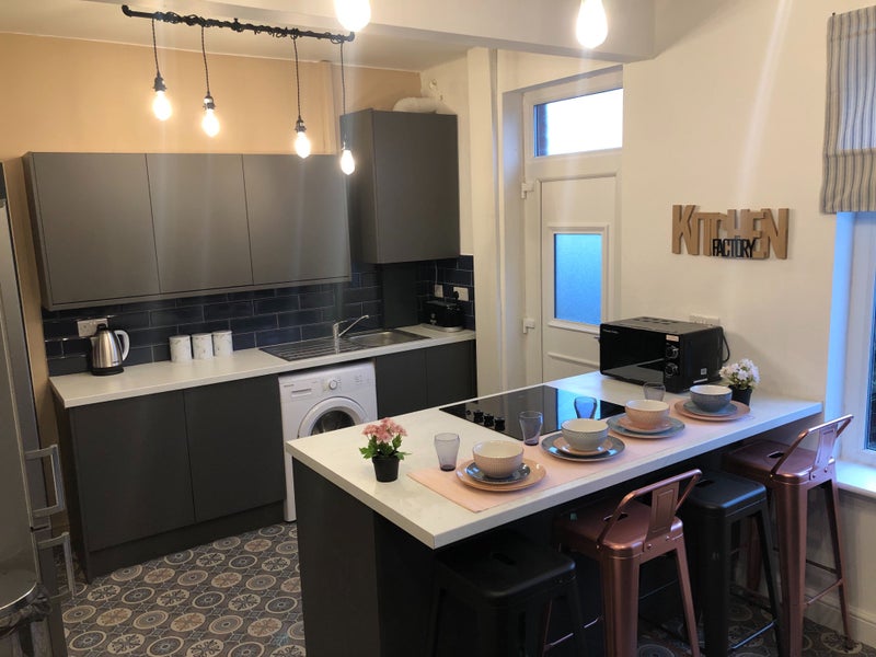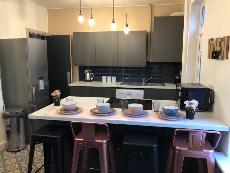 The house comes with a modern and spacious communal lounge and kitchen area with breakfast bar and stools.