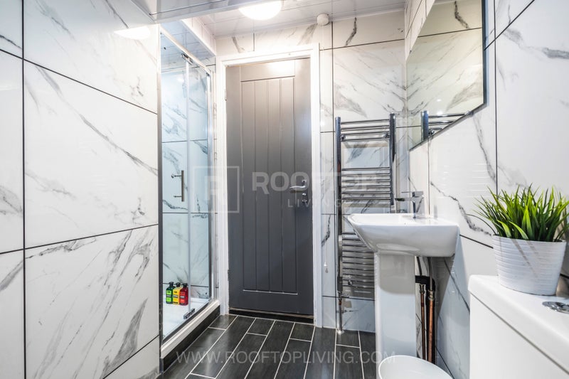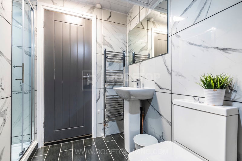 1 large fully tiled modern bathroom that comes with a rainfall shower.