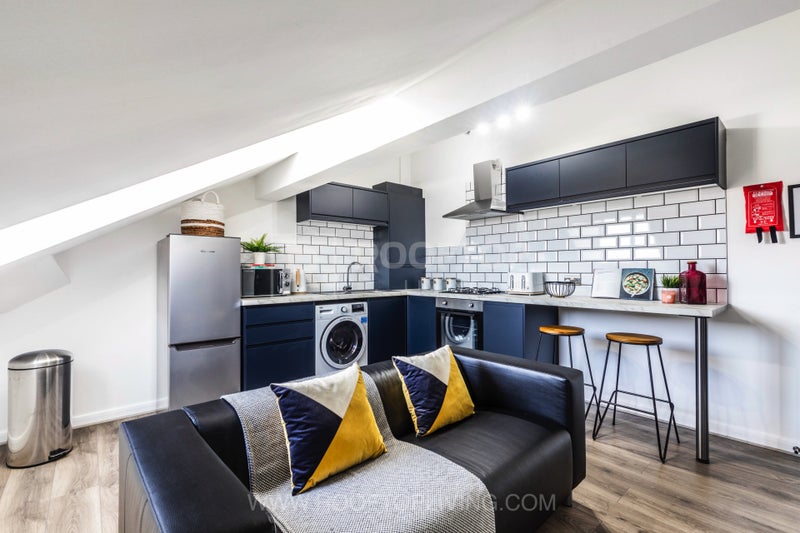 Open plan kitchen, comes with a fridge freezer, washer dryer, kettle, toaster and microwave.